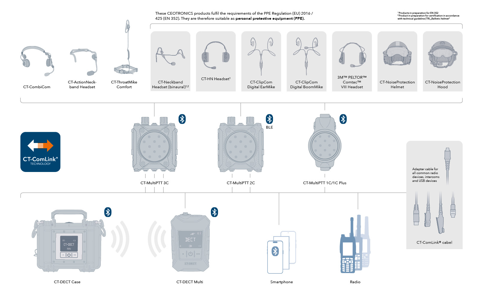 Rapid operational readiness and the perfect interaction of the technology used by the police, defense forces, rescue services, at the airport or in industry are crucial. CT-ComLink® technology was developed precisely for this purpose. Regardless of which radios, headsets or intercom systems are used, whether digital or analog, wired or via Bluetooth: CT-ComLink® works – now and in the future.