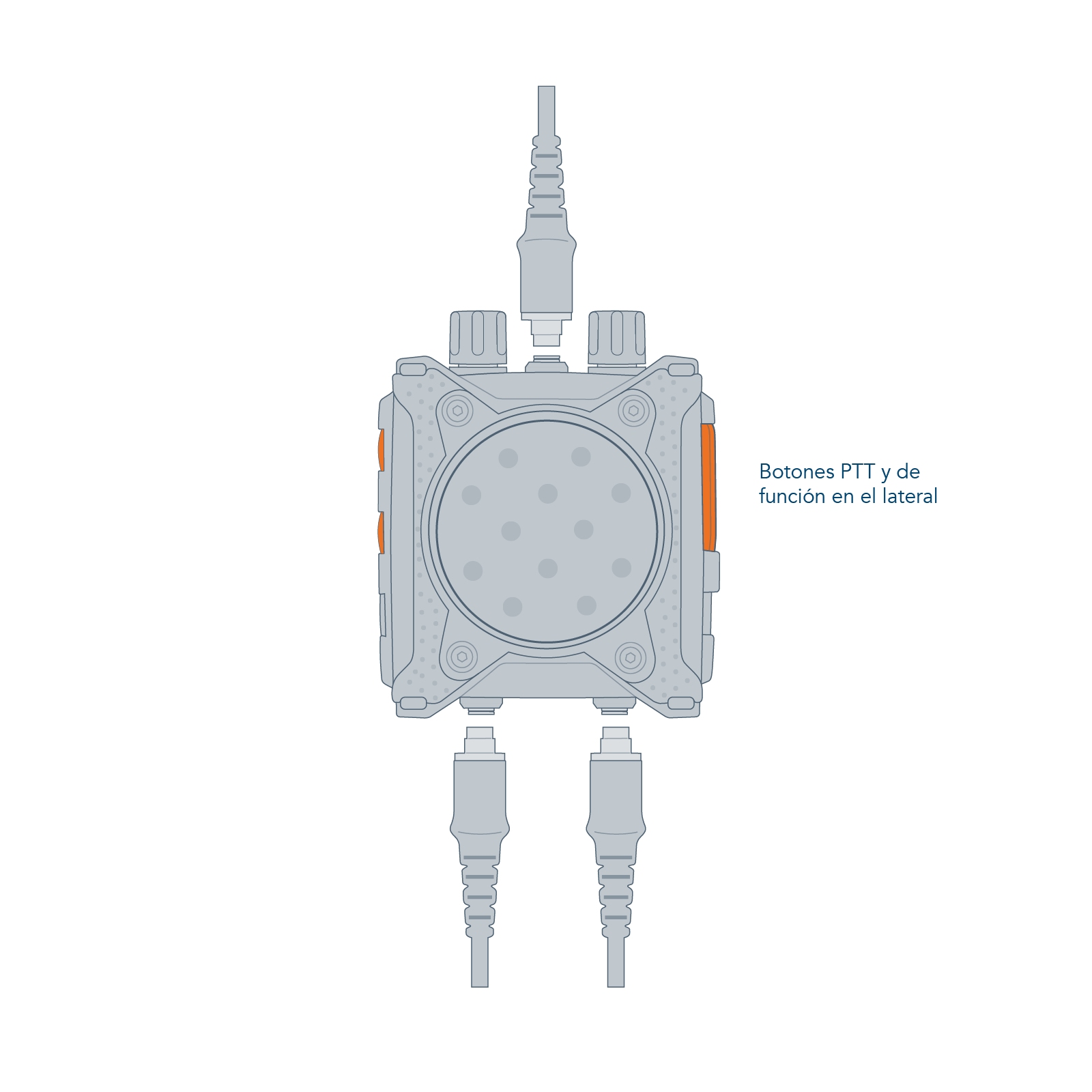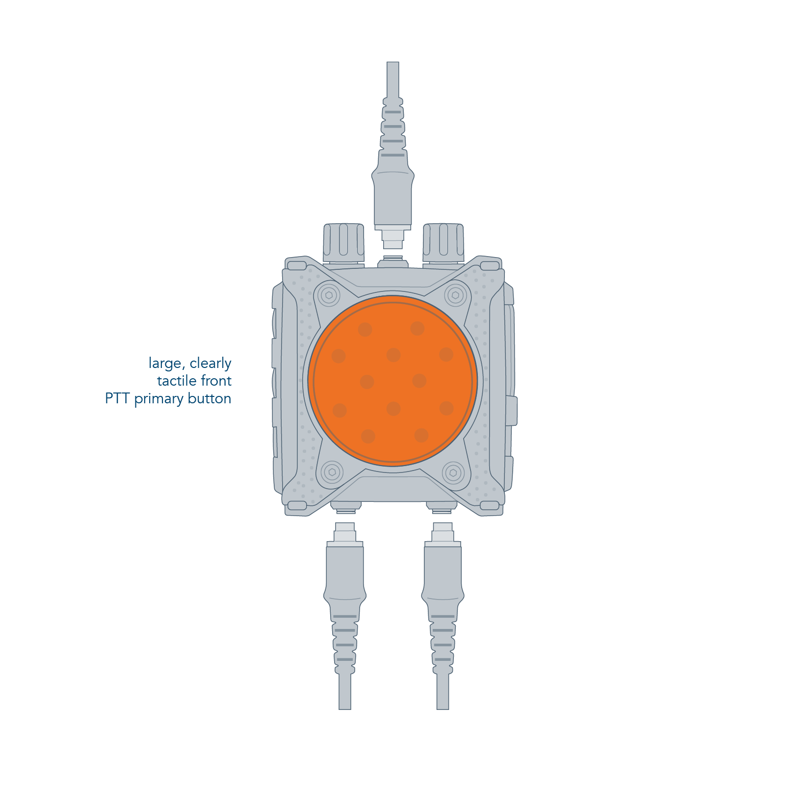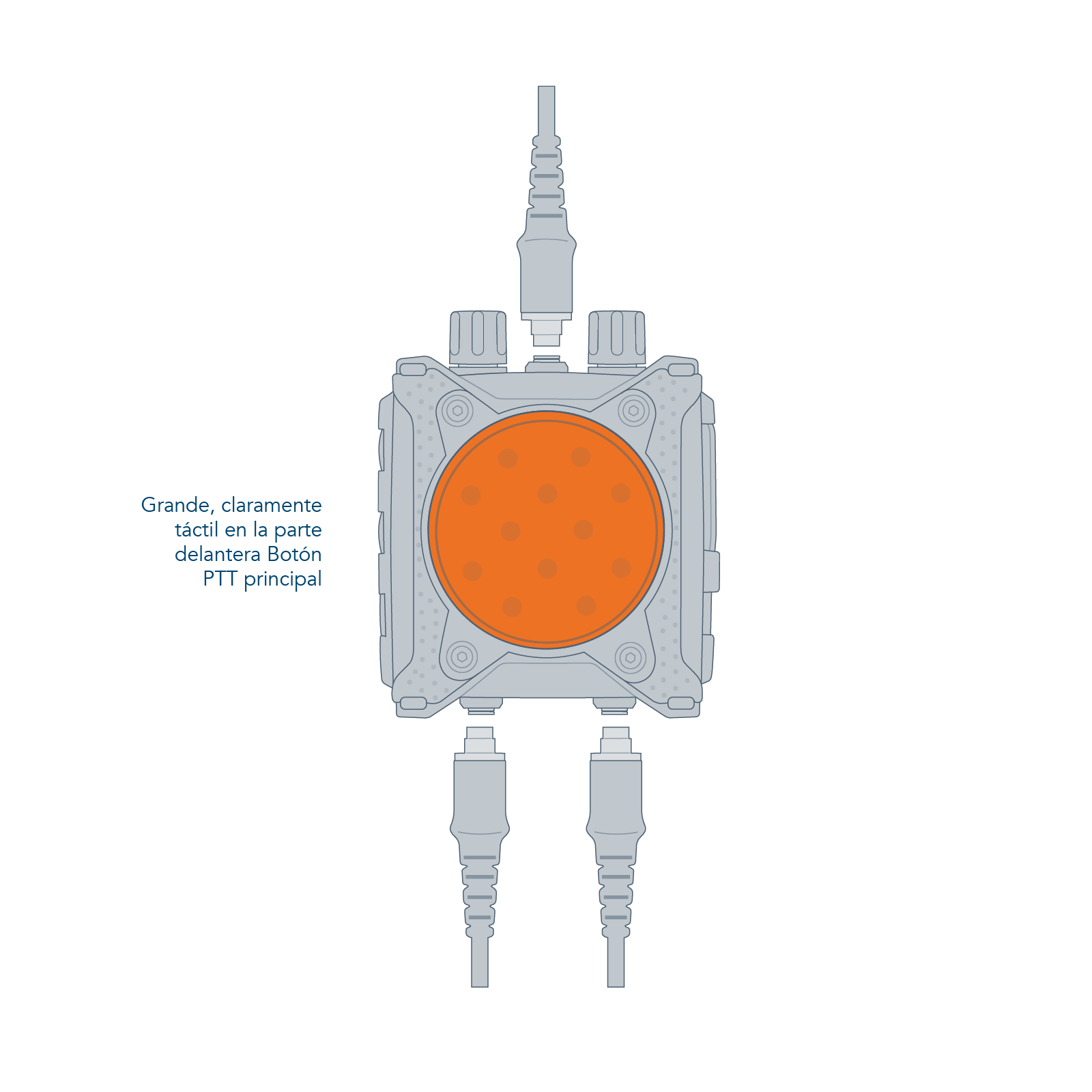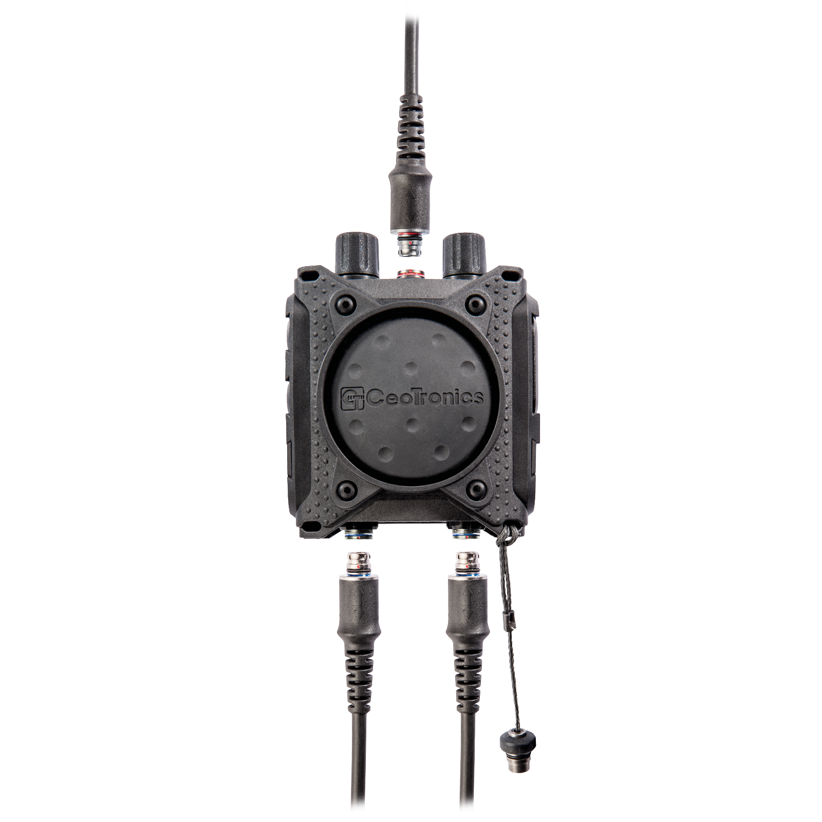 The CT-MultiPTT 2C has a large, clearly tactile front PTT. This makes it easy to operate even when wearing gloves. This ensures a high level of communication reliability, even in critical situations. The large multifunctional rotary controls can be gripped securely thanks to the guide grooves. Additional function buttons allow direct access to programmed additional functions of the connected radio devices. The CEOTRONICS voice menu with auditory feedback allows all basic settings or configuration changes to be made quickly, easily and intuitively: when navigating through the operating menu, the user of the CT-MultiPTT 2C receives feedback on the current setting as voice output. The extremely robust plug connections of this control unit are designed with break-away technology and automatically release for emergency unlocking from a defined tensile force. The CT-MultiPTT 2C can also be controlled remotely with the small, lightweight CT-WirelessPTT MIL.